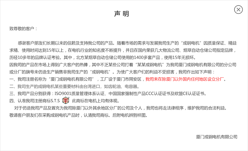 公告信息:   因我司的產(chǎn)品在市場(chǎng)上得到廣大客戶(hù)的熱捧,其中不乏某些公司打著“某某成鋼電機(jī)”為我司廈門(mén)成鋼電機(jī)有限公司的分公司或分廠的旗號(hào)來(lái)仿造生產(chǎn)銷(xiāo)售非我司生產(chǎn)的“成鋼電機(jī)”。為使廣大客戶(hù)們的利益不受損害,我司作出如下聲明: 一、我司注冊(cè)名稱(chēng)為“廈門(mén)成鋼電機(jī)有限公司”,工廠設(shè)于廈門(mén)市同安區(qū),我司未在除廈門(mén)以外國(guó)內(nèi)任何地區(qū)設(shè)立分廠。 二、我司生產(chǎn)的成鋼電機(jī)采用的齒輪、電容器、潤(rùn)滑油等均為臺(tái)灣進(jìn)口,并可提供海關(guān)報(bào)關(guān)單。 三、我司產(chǎn)品分別獲得:ISO9001質(zhì)量管理體系認(rèn)證、中國(guó)國(guó)家強(qiáng)制性產(chǎn)品CCC認(rèn)證證書(shū)及歐盟CE認(rèn)證證書(shū)。 四、認(rèn)準(zhǔn)我司注冊(cè)商標(biāo)S.T.S ???此商標(biāo)在電機(jī)上均有體現(xiàn)。 ????對(duì)于仿造我司產(chǎn)品及冒充為我司除廈門(mén)以外其余地區(qū)分廠的公司及個(gè)人,我司也將走法律程序,維護(hù)我司的合法利益。 敬請(qǐng)客戶(hù)朋友們?cè)诓少?gòu)成鋼電機(jī)產(chǎn)品時(shí),認(rèn)清我司商標(biāo)。后附電機(jī)辨別樣圖。